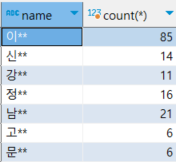 위와 같이 작성하면 '이**'인 사람끼리 group을 만들고, '신**'인 사람들끼리 group을 만들고... 같은 성씨끼리 group으로 묶이게 됩니다. count로 해당 범주에서의 데이터 개수를 세어줍니다. 여기서는 count를 통해 '이**'인 사람이 몇 명인지, '신**'인 사람이 몇 명인지 알 수 있습니다.