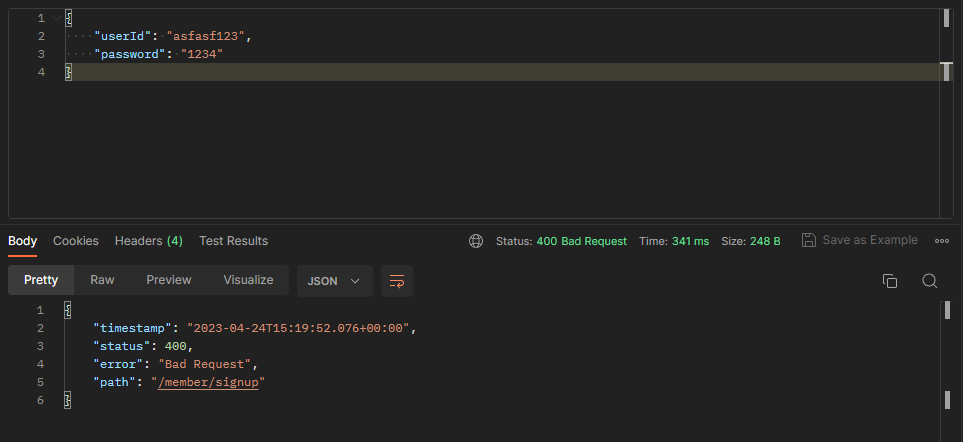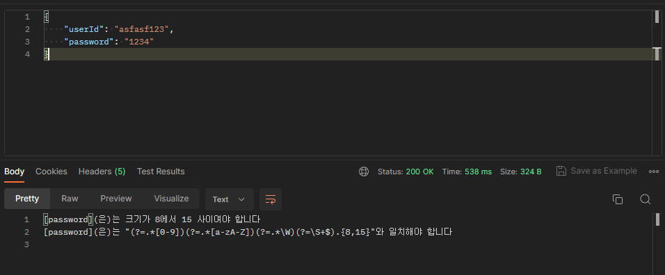 Resolved [org.springframework.web.bind.MethodArgumentNotValidException: Validation failed for argument [0] in public org.springframework.http.ResponseEntity com.example.sample.controller.MemberController.signup(com.example.sample.dto.SignupRequestDto) with 2 errors: [Field error in object 'signupRequestDto' on field 'password': rejected value [1234]; codes [Pattern.signupRequestDto.password,Pattern.password,Pattern.java.lang.String,Pattern]; arguments [org.springframework.context.support.DefaultMessageSourceResolvable: codes [signupRequestDto.password,password]; arguments []; default message [password],[Ljakarta.validation.constraints.Pattern$Flag;@4ccb9e30,(?=.*[0-9])(?=.*[a-zA-Z])(?=.*\W)(?=\S+$).{8,15}]; default message ["(?=.*[0-9])(?=.*[a-zA-Z])(?=.*\W)(?=\S+$).{8,15}"와 일치해야 합니다]] [Field error in object 'signupRequestDto' on field 'password': rejected value [1234]; codes [Size.signupRequestDto.password,Size.password,Size.java.lang.String,Size]; arguments [org.springframework.context.support.DefaultMessageSourceResolvable: codes [signupRequestDto.password,password]; arguments []; default message [password],15,8]; default message [크기가 8에서 15 사이여야 합니다]] ]