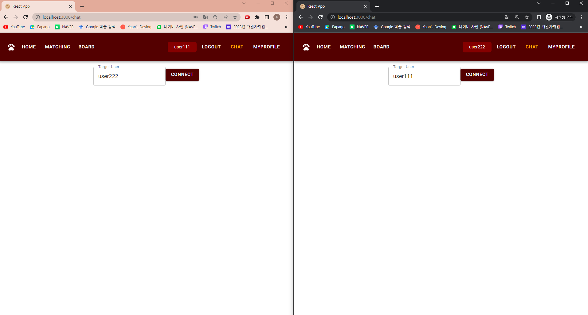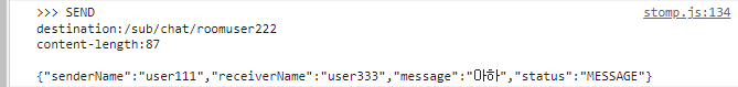 ?!! user222에게로 보내졌다. 이것저것 바꾸다가 엉킨 모양이다. user111에서 user333채팅방으로 이동하면 /sub/chat/roomuser222 가 아닌 /sub/chat/roomuser333으로 바뀌어야 하는데 안바뀐 것 같다.