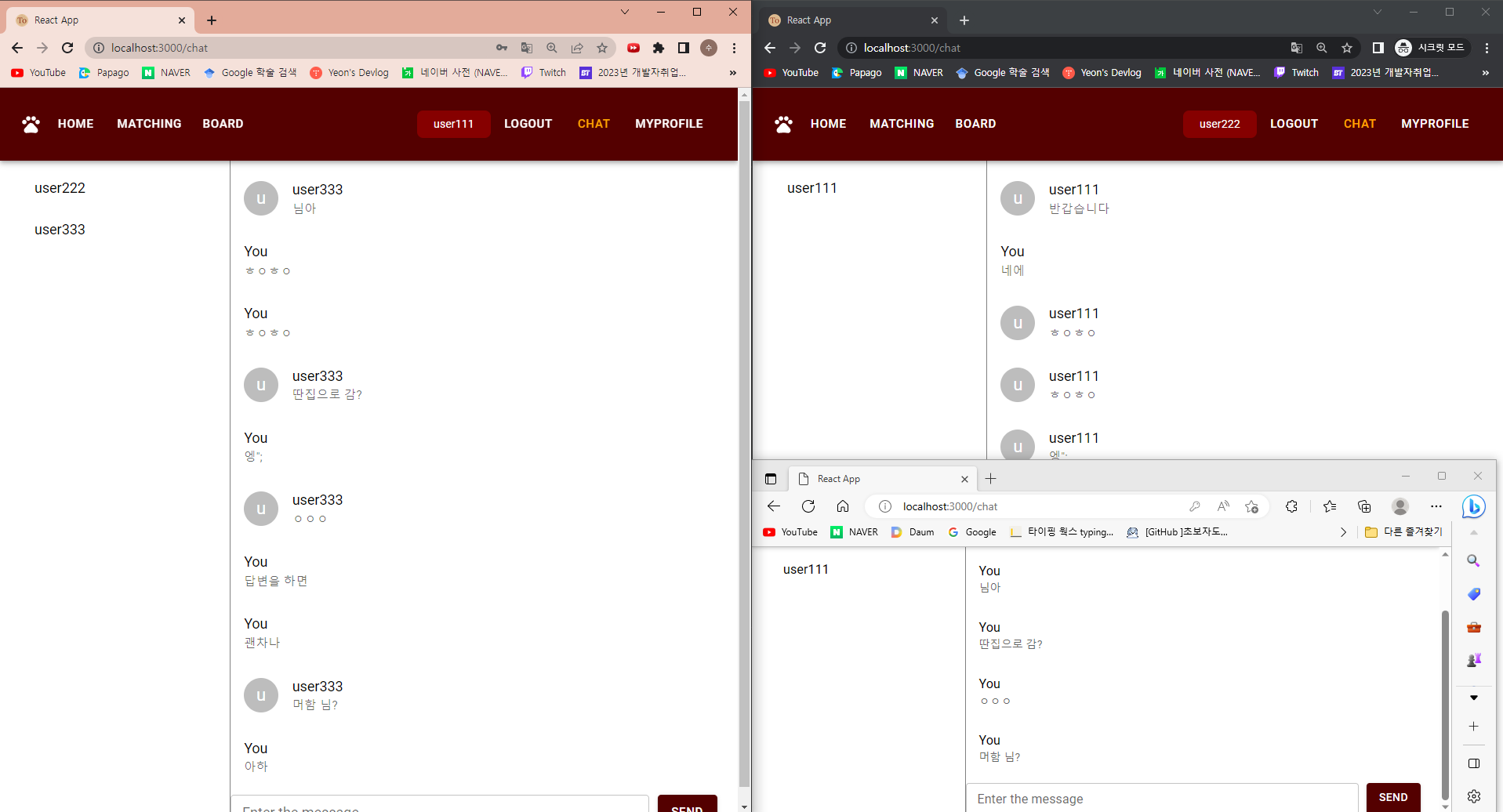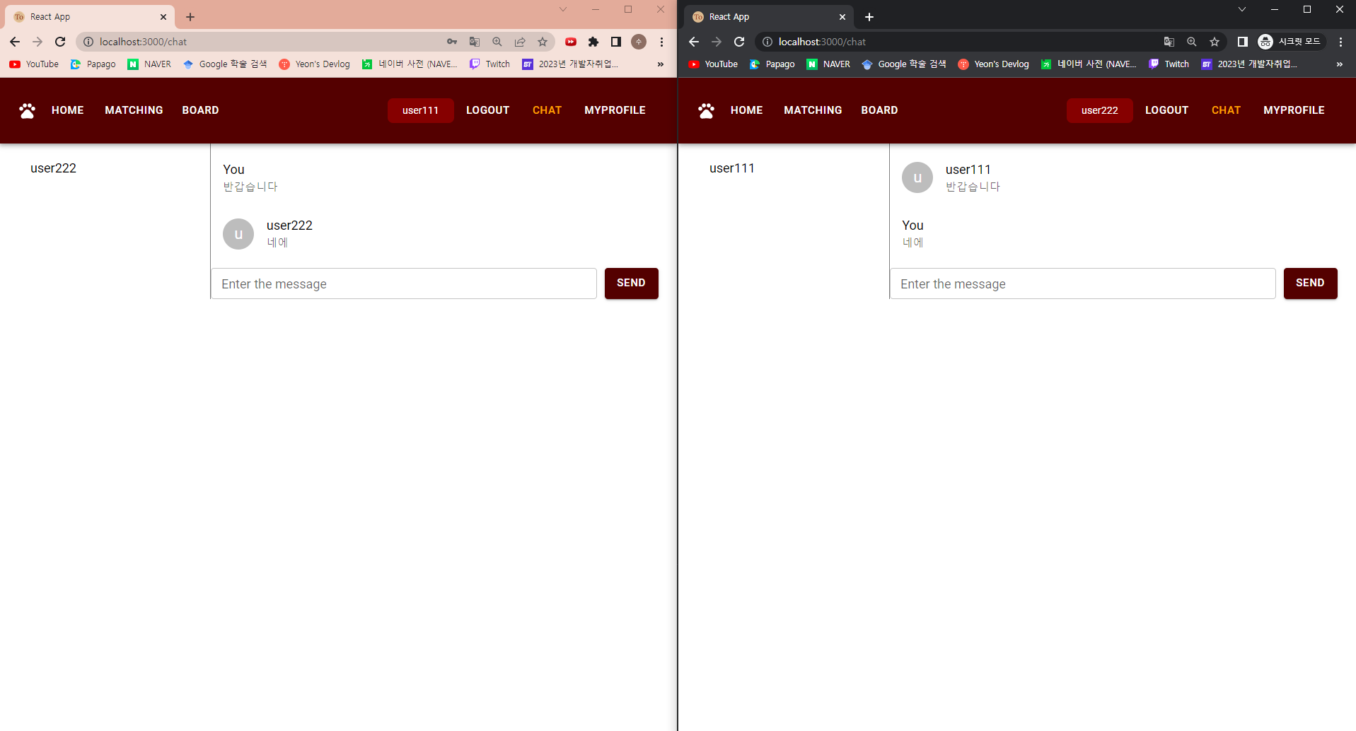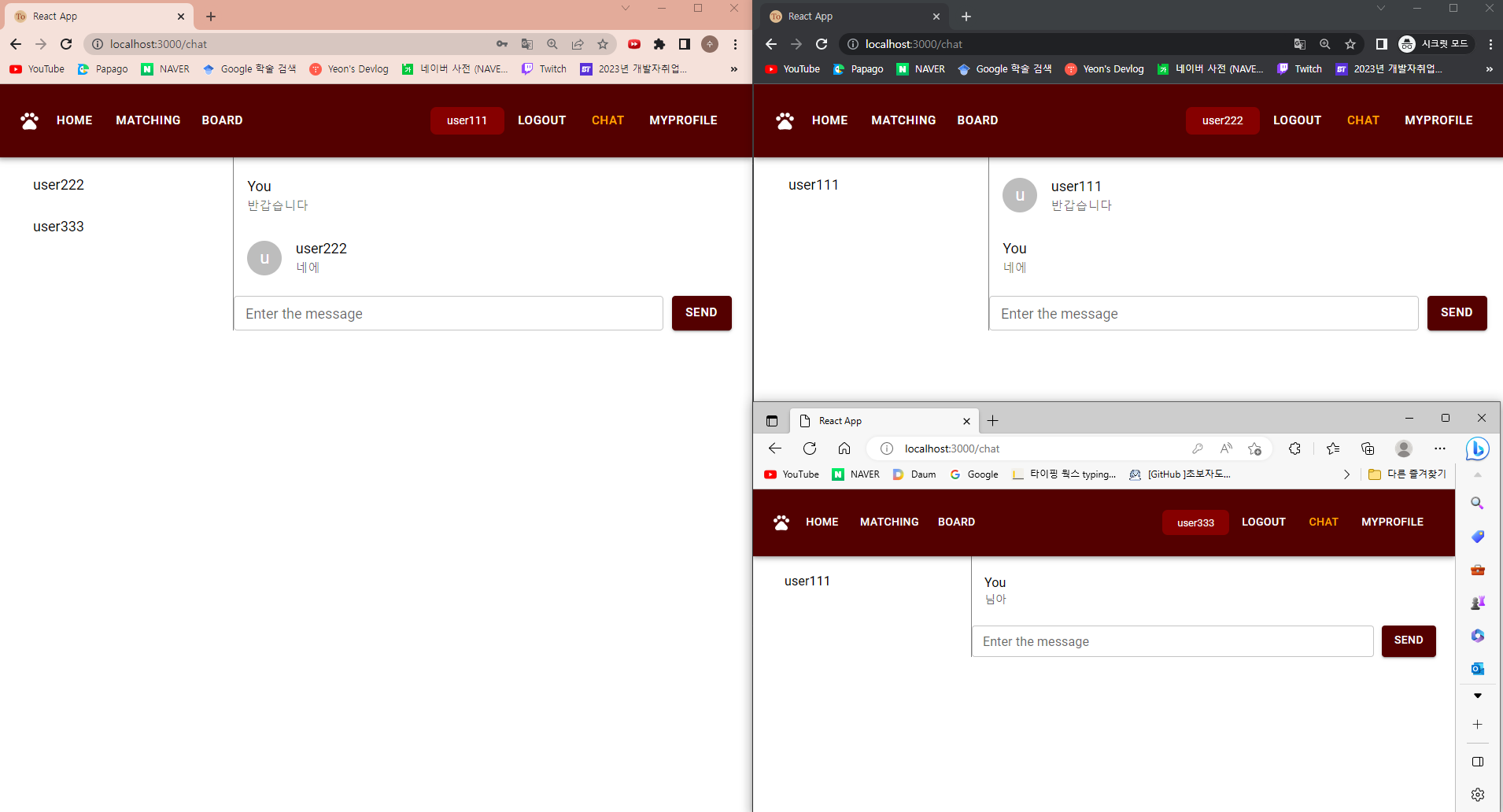 여기서 다른 사람이 user111에게 채팅을 보내면 user111 쪽에 user333 이 보낸 채팅방이 목록에 뜬다.