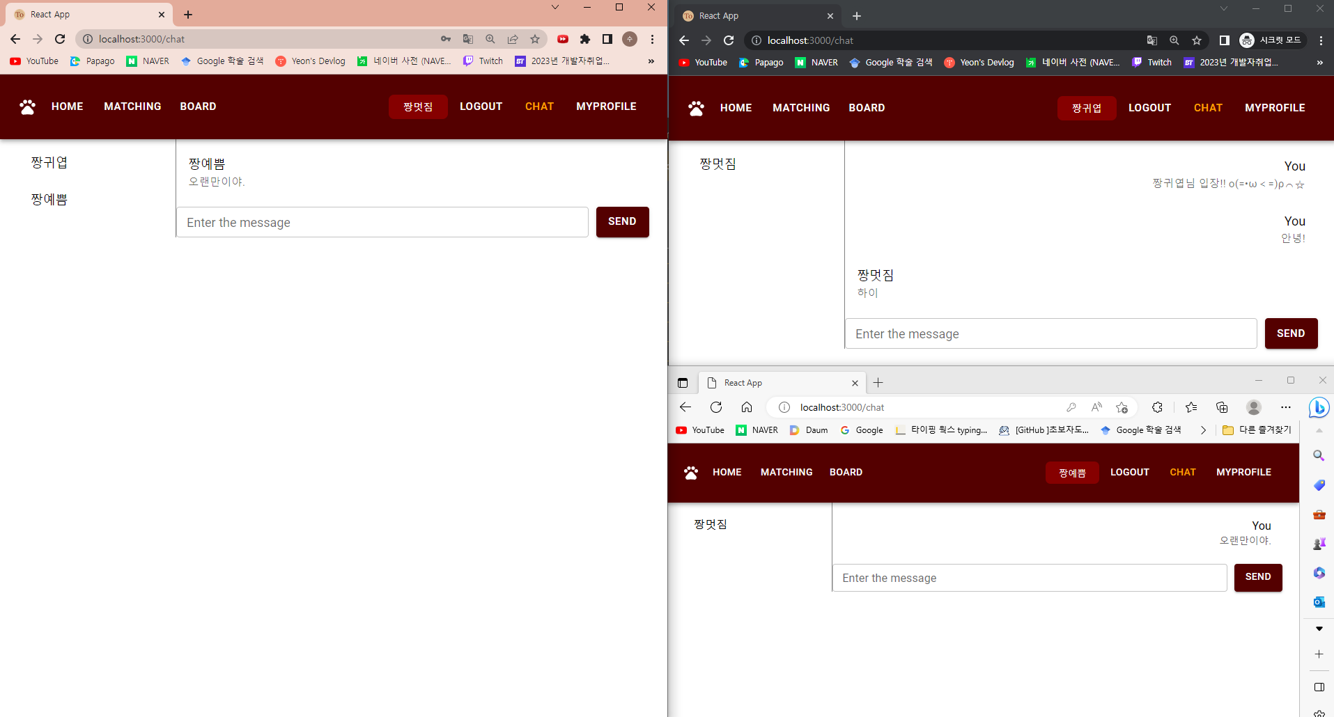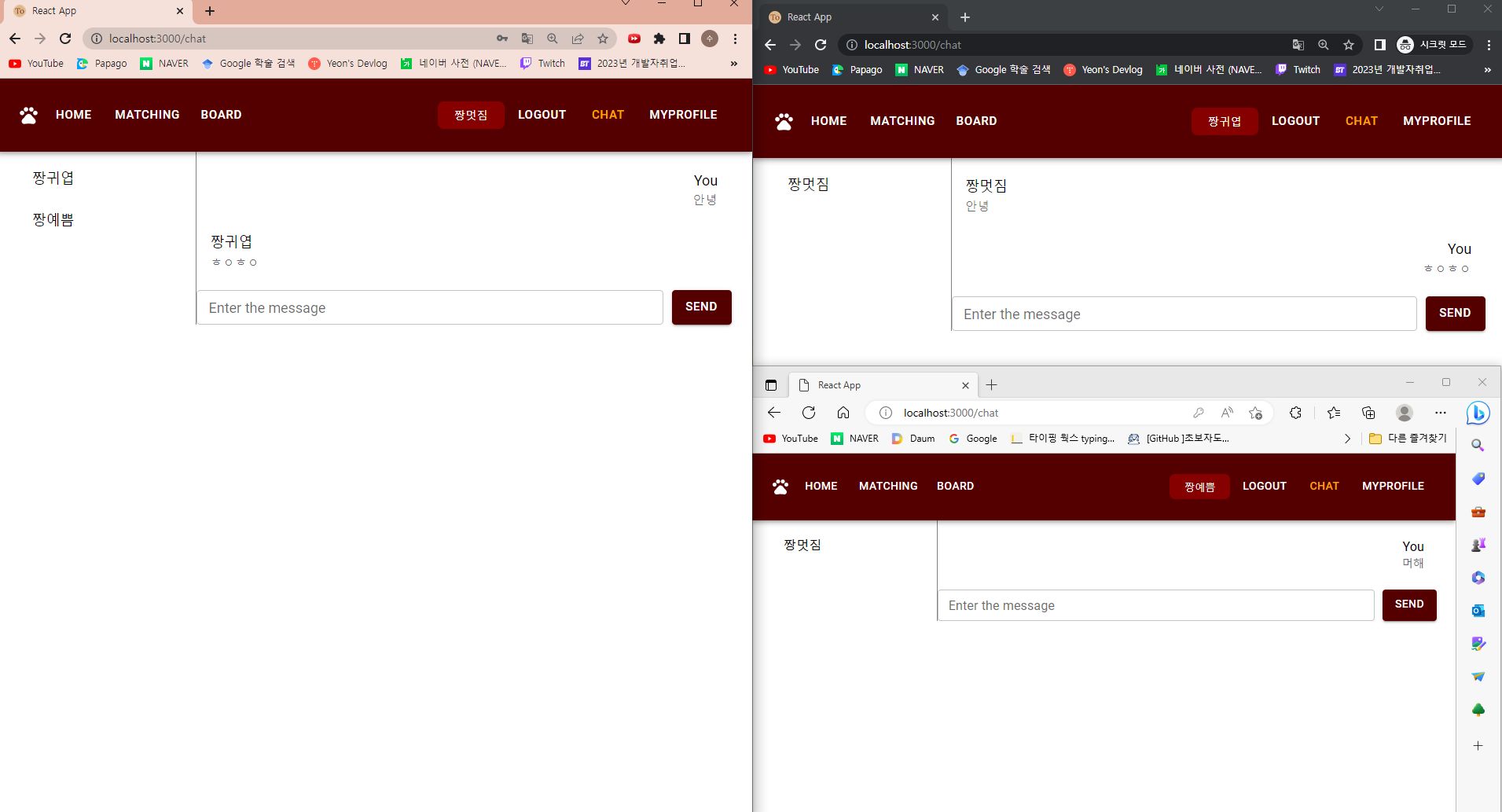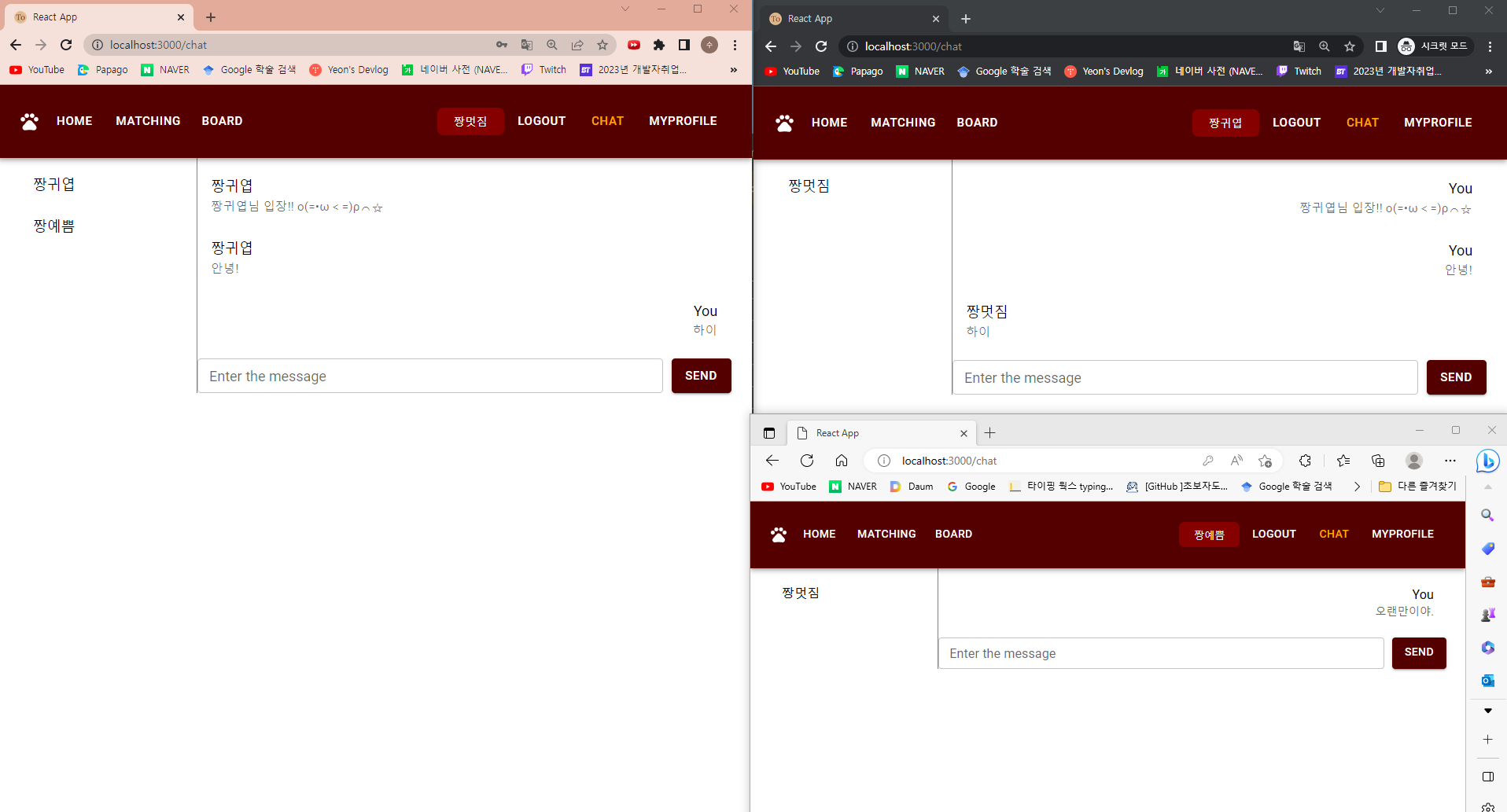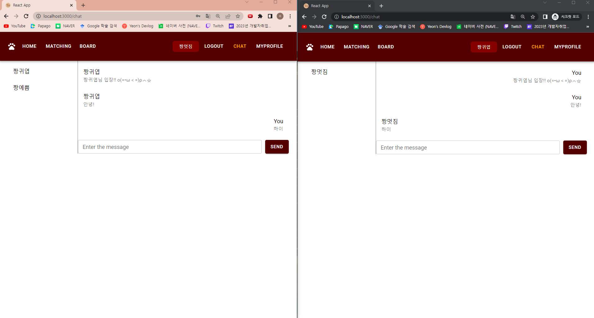 드디어 예쁨이가 멋짐이에게 채팅을 보낼 수 있게 되었다...!!! o(TヘTo)