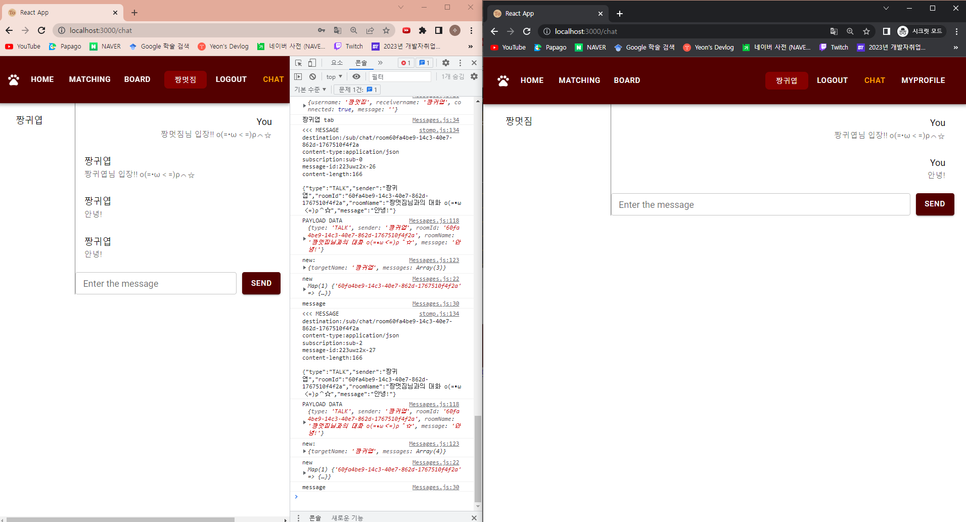 여기서 짱예쁨이 짱멋짐과의 채팅을 시작한다. 짱예쁨은 입장 메시지를 보내면서 짱멋짐에게 구독 요청을 보냈고, 짱멋짐이 받은 roomId를 토대로 해당 채팅방을 구독하여 채팅을 정상적으로 수신한 것을 볼 수 있다...!!!