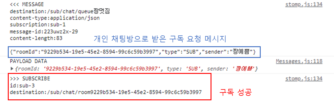 유저2는 개인방에 온 메시지를 보고, type이 SUB이면 해당 roomId를 구독하도록 한다.