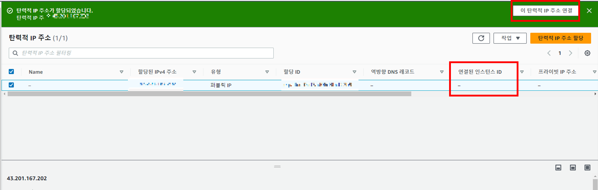 연결된 인스턴스 ID가 비어있다. 연결시켜 주자! 이 탄력적 IP 주소 연결 클릭한다.