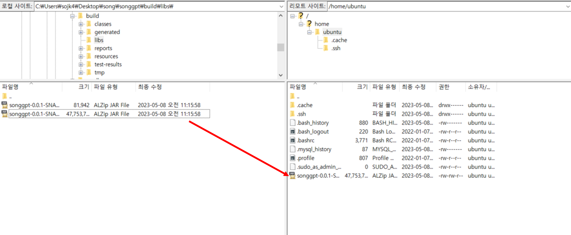 3. 파일질라를 이용해 jar 파일 업로드