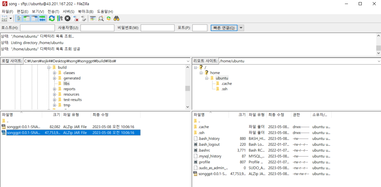 필자는 로컬에서 jar파일을 빌드한 후 파일질라를 통해 업로드 하고 실행했다.