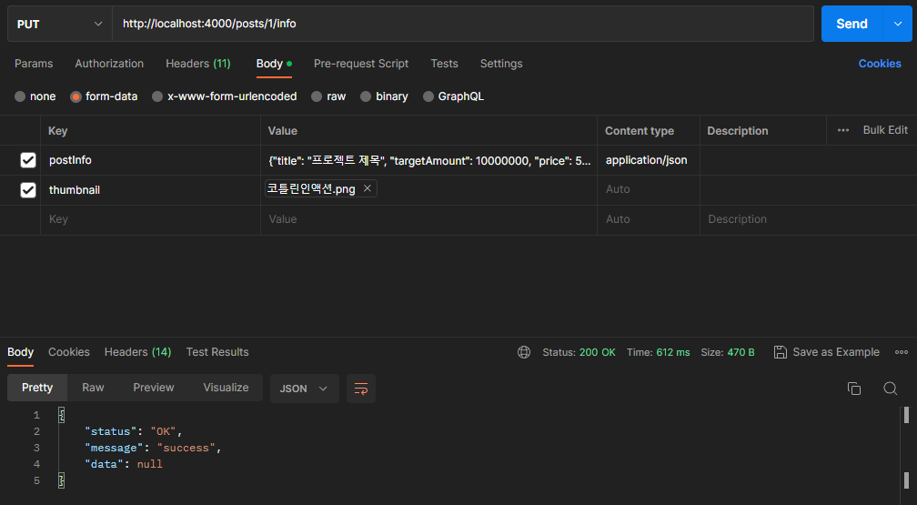 PostMan에서 테스트할 때에는 postInfo의 value값으로 PostInfoRequestDto 클래스에 맞는 Json을 작성해주면 된다.