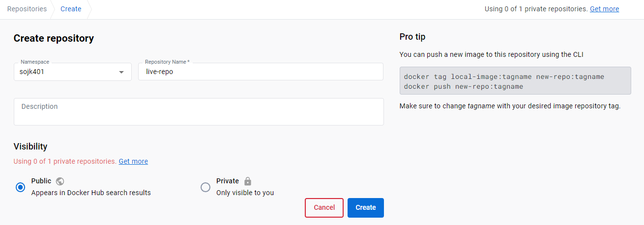 Namespace는 변경하지 않았다. 레포지토리 이름은 원하는대로 생성해주면 된다.