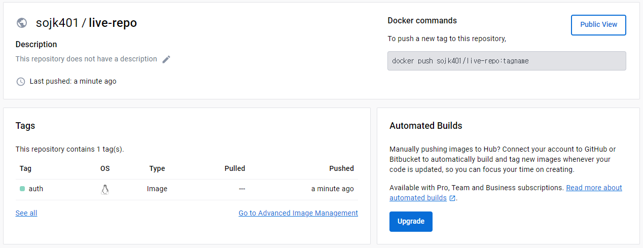 위 명령어를 수행하면 이름이 sojk401/live-repo이고 tag는 auth라는 도커 이미지가 생성된 것을 확인할 수 있다.