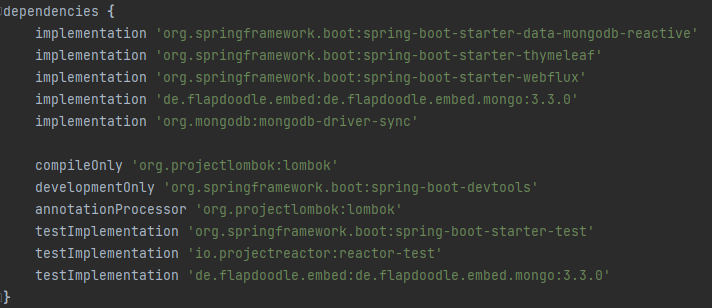 testImplementation 'de.flapdoodle.embed:de.flapdoodle.embed.mongo:3.3.0'