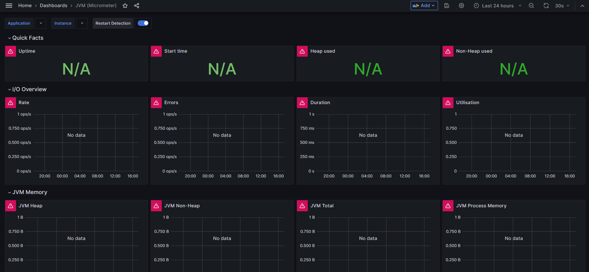 Grafana에서 JVM(Micrometer)를 import 해서 대시보드를 생성했다. 연결이 잘 된 줄 알았더니 N/A...?