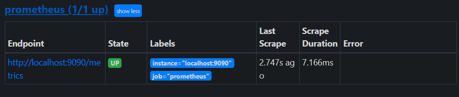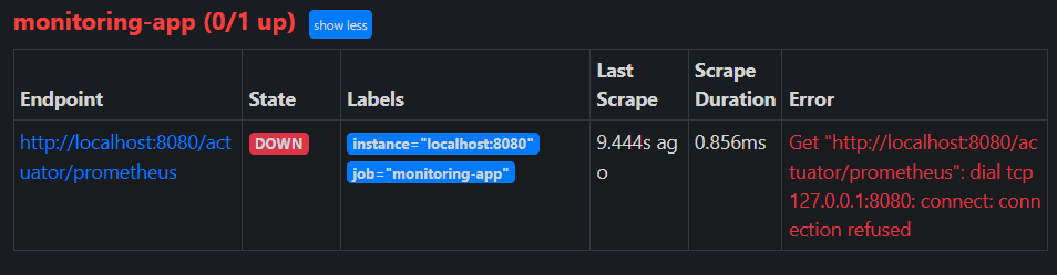 prometheus 컨테이너가 올라가고, localhost:9090에 접속해서 Status > Targets에 들어갔더니 내가 설정한 모니터링 타겟이 없었다. prometheus.yml에서 설정한대로면 EndPoint는 http://localhost:8080/actuator/prometheus이어야 했고, labels는 job="monitoring-app"으로 나타나야 했다.