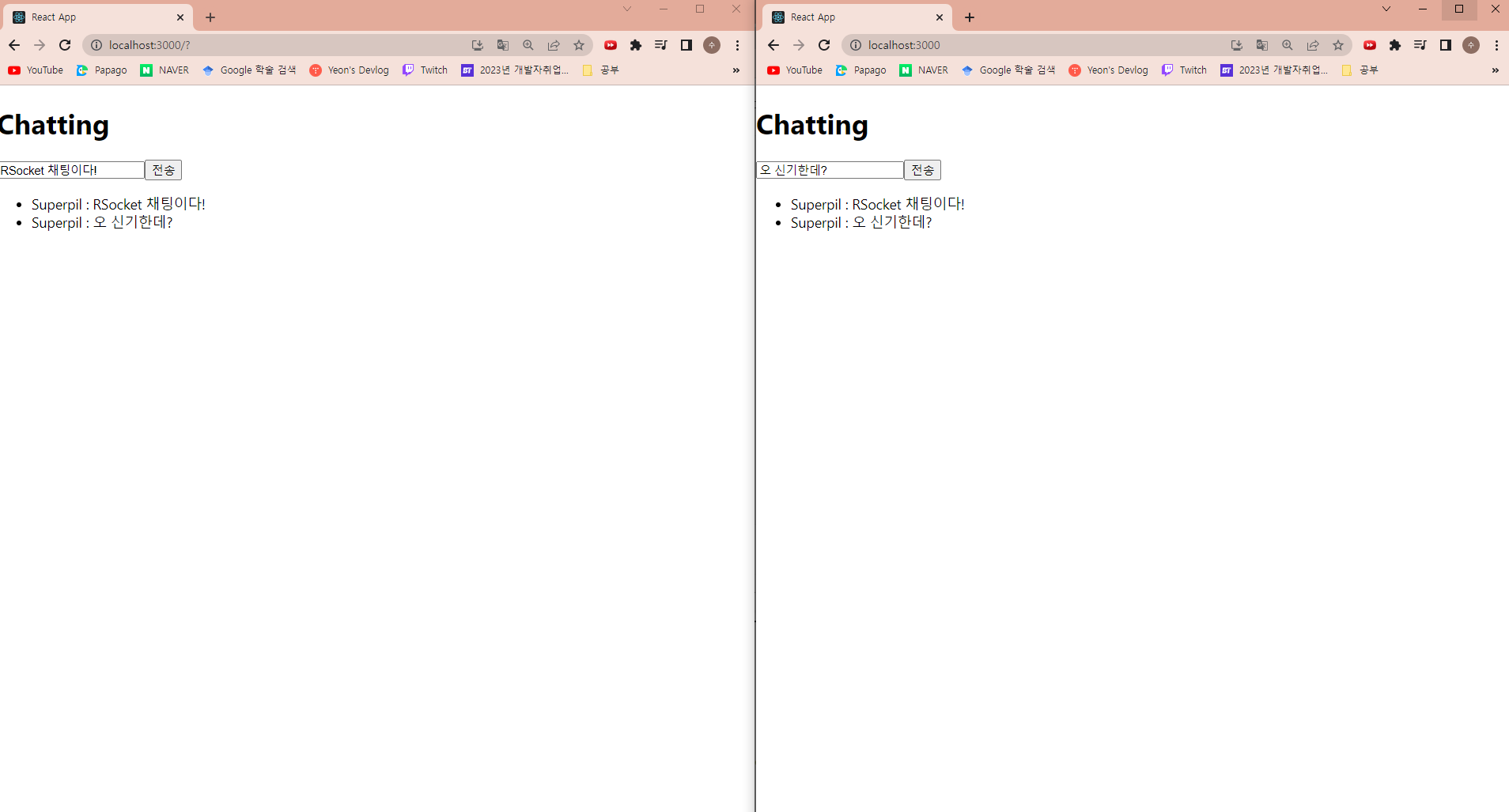 창을 두 개 띄워놓고 테스트해보자.