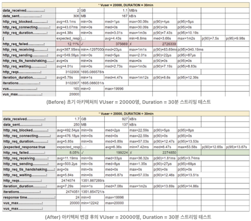 위와 같이 서버 아키텍처를 변경하고 K6로 다시 테스트를 해보았다.