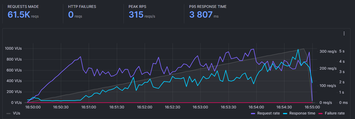 한 명의 스트리머가 방송을 송출하고, 방송 시청을 보내는 가상 유저 1000명, Duration 5분으로 테스트 해보았다.