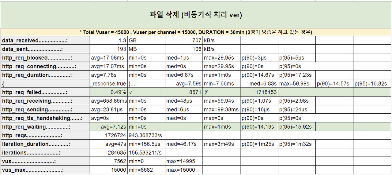 결과를 보면, 요청 실패율이 11.09%이다. 우리는 이 현상의 원인을 삭제 로직이 동기식으로 작성되어 있기 때문이라고 생각했다.