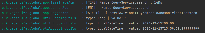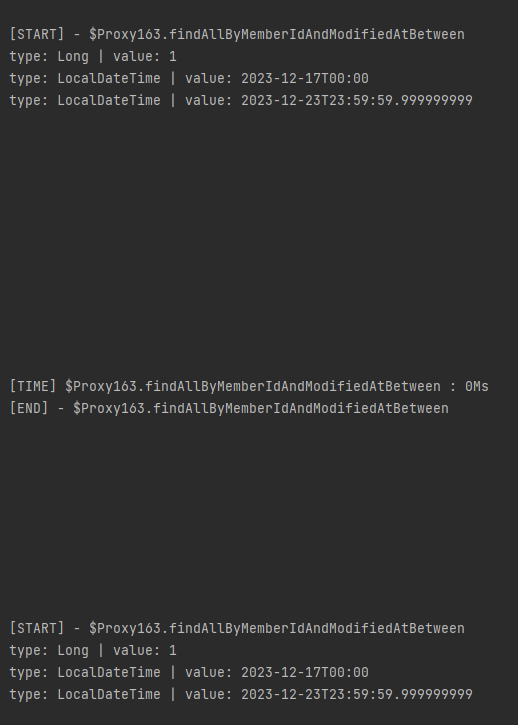 일주일 중에 각 날짜에 대한 MealLog를 가져와야 하기 때문에 findAllByMemberIdAndModifiedAtBetween는 총 7번 수행된다. 각 인자는 startDate: 2023-12-17T00:00, endDate: 2023-12-17T23:59:59.9999 (각 날짜의 처음과 끝, 17일,18일...23일)으로 들어가야 하는데, endDate가 변하지 않고, startDate도 .plueDay(1)이 되지 않는 것을 확인 할 수 있다.