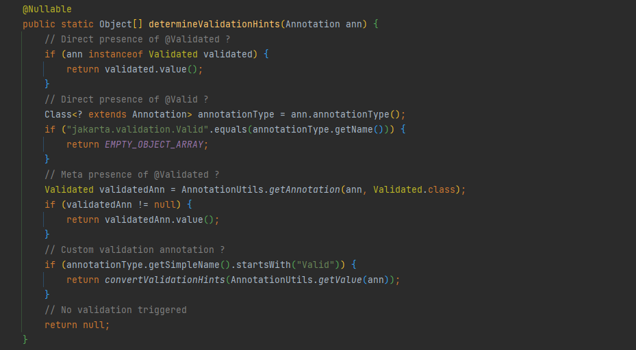 해당 메서드에서는 애노테이션이 jakarta.validation.Valid인지 Validated 인스턴스인지 Valid로 시작하는지 확인한 후 적용할 검증 힌드들을 Object Array로 반환한다.