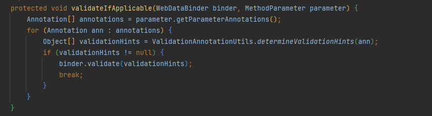 `validateIfApplicable` 메서드에서 `DataBinder` 클래스의 `validate` 메서드 호출