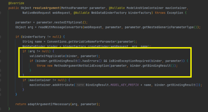 해당 클래스의 `resolveArgument()` 메서드 내부에서 유효성 검증이 진행된다.