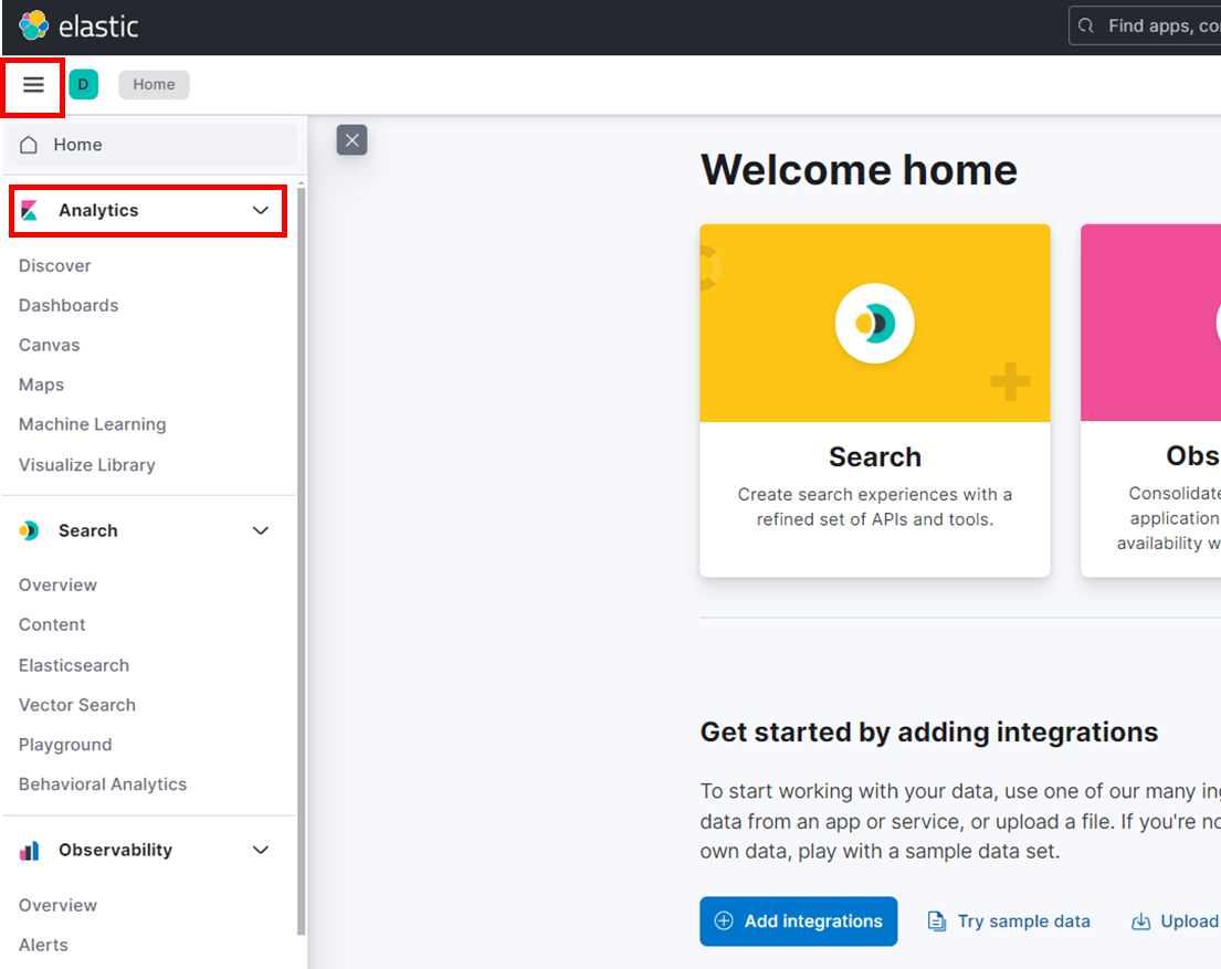좌측 메뉴에서 Analytics 카테고리가 Kibana이다.