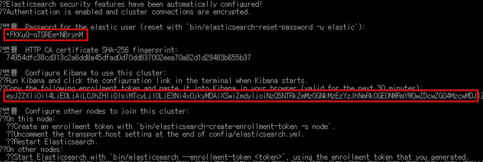 첫 실행 시 초기 비밀번호와 키바나 연결을 위한 토큰 값을 제공한다.