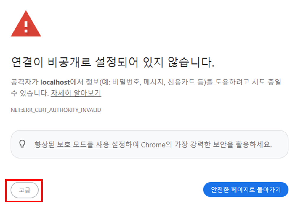 고급 버튼을 눌러 (안전하지 않음)으로 이동을 클릭한다.