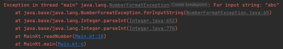 str을 Int형으로 변환하려 했으나 abc는 숫자로 변환할 수 없기에 NumberFormatException 에러가 발생합니다.