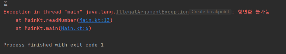 하지만 제가 1번을 예외처리하면서 toIntOrNull()을 사용하였는데 null과 공백 같은 경우도 모두 처리가 되더군요. 생각해보니 공백이나 null은 숫자로 변환할 수 없으니 한 번에 예외처리가 가능함을 알았습니다.