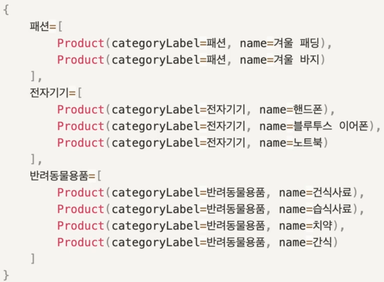 categoryLabel을 key로 갖고 카테고리에 해당하는 상품 목록을 value로 갖는 Map 타입으로 변환