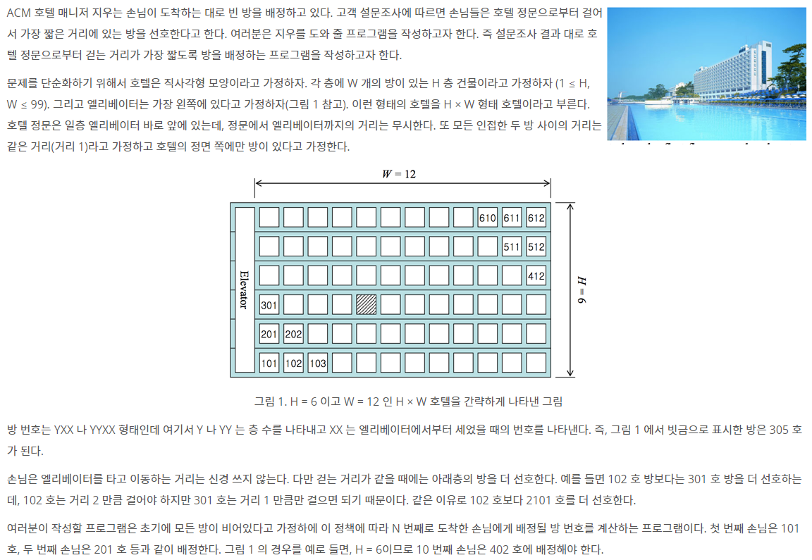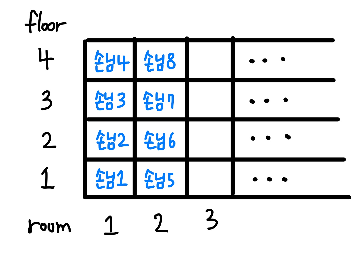 프로그램은 표준 출력에 출력한다. 각 테스트 데이터마다 정확히 한 행을 출력하는데, 내용은 N 번째 손님에게 배정되어야 하는 방 번호를 출력한다.